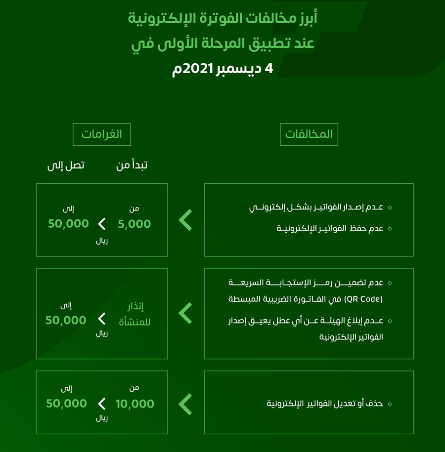 من المقرر أن يبدأ تنفيذ المرحلة الأولى من الفواتير الإلكترونية في 4 ديسمبر 2021. وقد أوضحت الزكاة والضرائب والجمارك السعودية أبرز المخالفات والغرامات الفواتير الإلكترونية الخاصة بتنفيذ المرحلة الأولى من خلال حساباتها على تويتر.